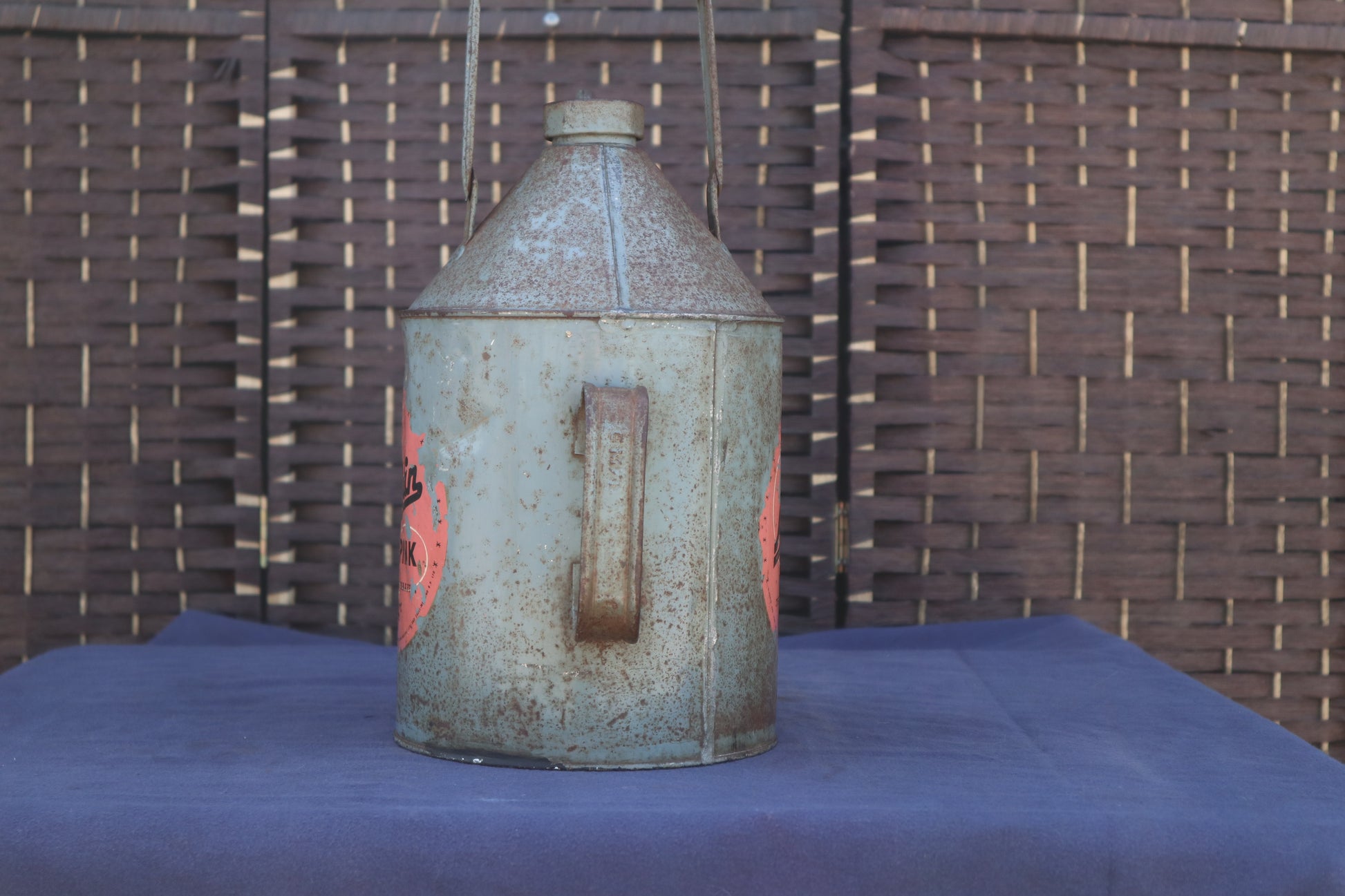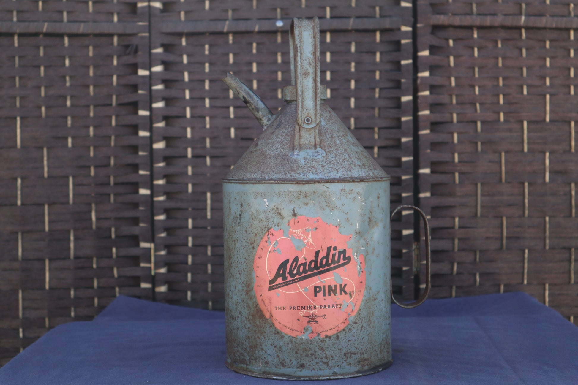 This vintage Aladdin Pink Paraffin can is a must-have for any Petroliana collector. In its original condition and pink sticker, it is perfect for display, bringing a touch of nostalgia to any space. It is in used condition, adding to its charm.